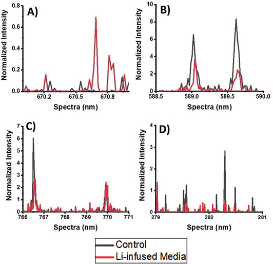在图2a中,在正常培养基中生长的细胞未检测到锂特征谱线,然而在含1.0mm锂的培养基中生长的细胞内检测到波长670.7nm左右的锂特征谱线;在同一张光谱中钠的特征谱线588.9nm和589.5nm被检测到(图2b),钾的特征谱线766.5nm和769.9nm被检测到(图2c),镁的特征谱线虽然不太明显,但是在280.3nm和280.5nm波长处仍然可以分辨出来。通过这些数据显示,锂可以通过钠通道或钙通道等不同的点进入哺乳动物细胞,也可以通过配位体门控阳离子通道和线粒体膜渗透。