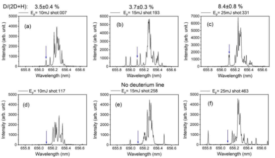 对于在此次实验中的发现,既重要,又令人惊讶。为了证明d的产生,引入激光诱导击穿光谱技术检测了d/(2d h)比值随着实验条件的变化。使用飞秒脉冲ti:sa激光器,波长795nm,脉宽40fs,通过聚焦镜头,照射到放置于真空腔室的靶材表面(图2);h和d的α线相差0.18nm,为了将其分辨开,使用了中阶梯单色仪 demon(ltb lasertechnik berlin,germany),检测范围190-900nm可调,分辨率2.5-12pm。